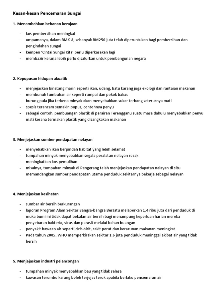 Contoh contoh karangan kesan-kesan pencemaran alam sekitar Pencemaran alam sekitar yang berlaku melanda pada masa kini telah mendatangkan beberapa keburukan kepada masyarakat dan negara. Pencemaran alam sekitar telah memberi kesan yang buruk terhadap hidupan di dunia pada masa kini. Ianya di perincikan dalam para seterusnya.