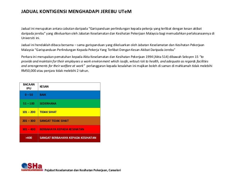 Asia Pacific University APU Technology Park Malaysia Bukit Jalil Kuala Lumpur 57000 Malaysia. FACULTY OF EDUCATION AND LANGUAGES HBHE 2203 KESIHATAN DIRI DAN KELUARGA SEPTEMBER 2013 Name. Akibat bencana jerebu ini kerajaan telah mengisytiharkan darurat jerebu bermula 11 Ogos 2005 sehingga ke suatu tarikh yang ditetapkan kemudian berkuat kuasa serta merta di Kuala Selangor dan Pelabuhan Klang yang mencatatkan Indeks Pencemaran Udara IPU 531 dan 529.