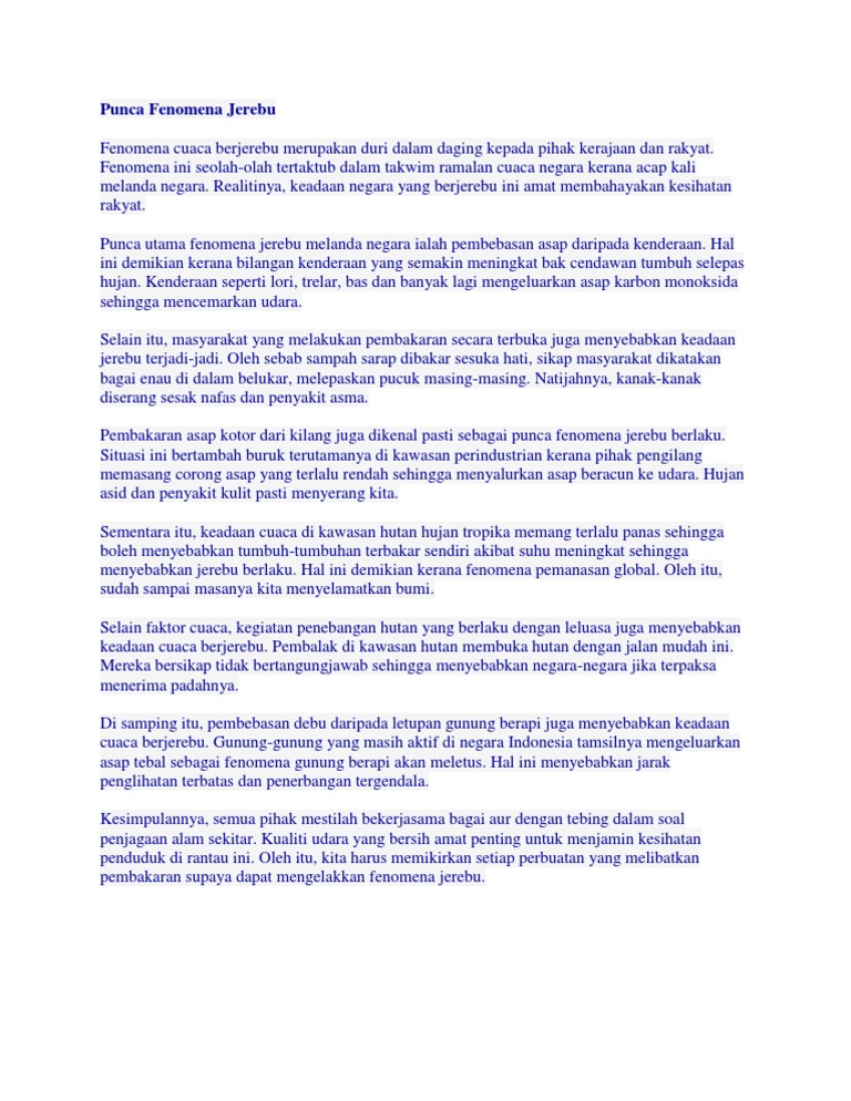 Bersama-sama ini anda boleh semak dan rujuk contoh karangan terbaik punca-punca masalah jerebu sebagai panduan dan semakan para pelajar. Pada amnya fenomena jerebu juga berpunca daripada pencemaran udara. Hal ini berlaku kerana jerebu menyebabkan badan menjadi lemah dan imunisasi semakin rendah.
