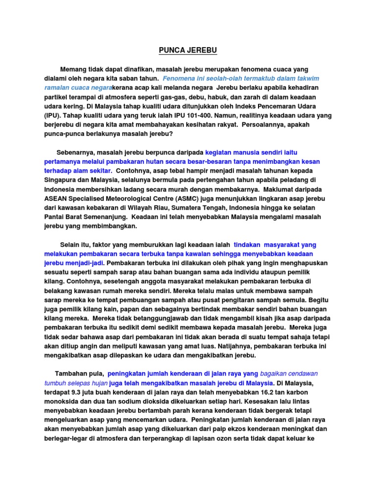 1 JEREBU Jerebu berlaku disebabkan terdapat banyak debu asap habuk dan bahan-bahan pencemar lain yang terapung-apung di udara akibat aktiviti manusia dan secara semulajadi. Kebakaran sering terjadi disebabkan cuaca panas yang berpanjangan dan keadaan kestabilan atmosfera yang tinggi. Selain itu jerebu juga boleh menjejaskan kesihatan manusia misalnya kesukaran untuk bernafas.
