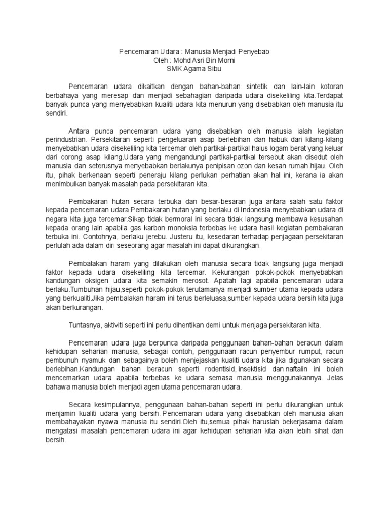 Punca punca pencemaran udara karangan spm. Dewasa ini kita sering dikejutkan dengan bencana alam yang berlaku di seluruh dunia. Bahan-bahan ini kebanyakannya merupakan bahan buangan industri asap ekzos kenderaan tindakan pembalakan dan sebagainya yang mengeluarkan zarah-zarah pepejal dan gas yang terlepas ke dalam udara. KARANGAN BAHASA MELAYU SPM.